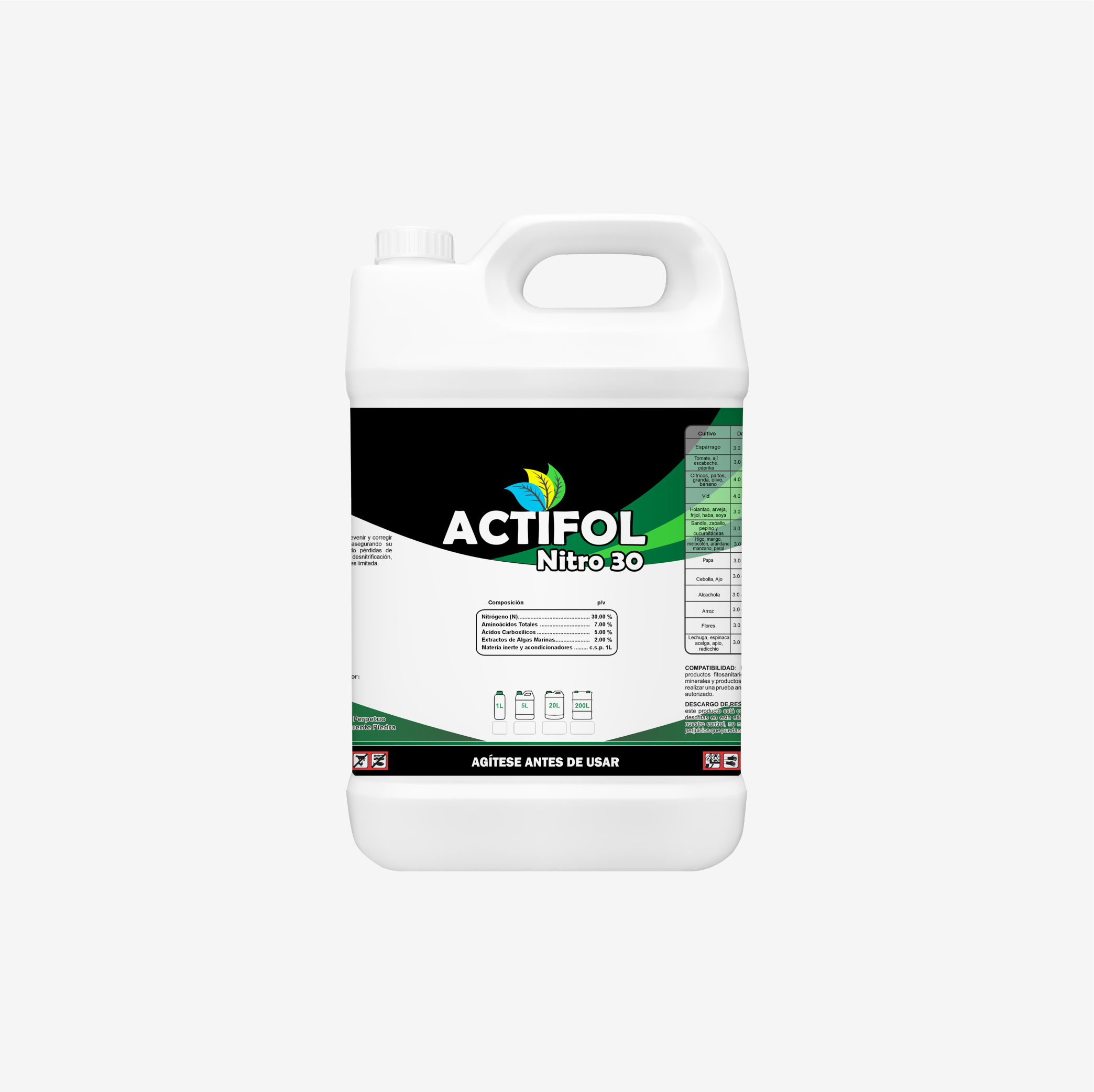 ACTIFOL NITRO 30: Está indicado para prevenir y corregir carencias de Nitrógeno por vía foliar, asegurando su absorción directa por la planta y evitando pérdidas de nitrógeno por lixiviación, volatilización o desnitrificación, especialmente cuando la absorción radicular es limitada.