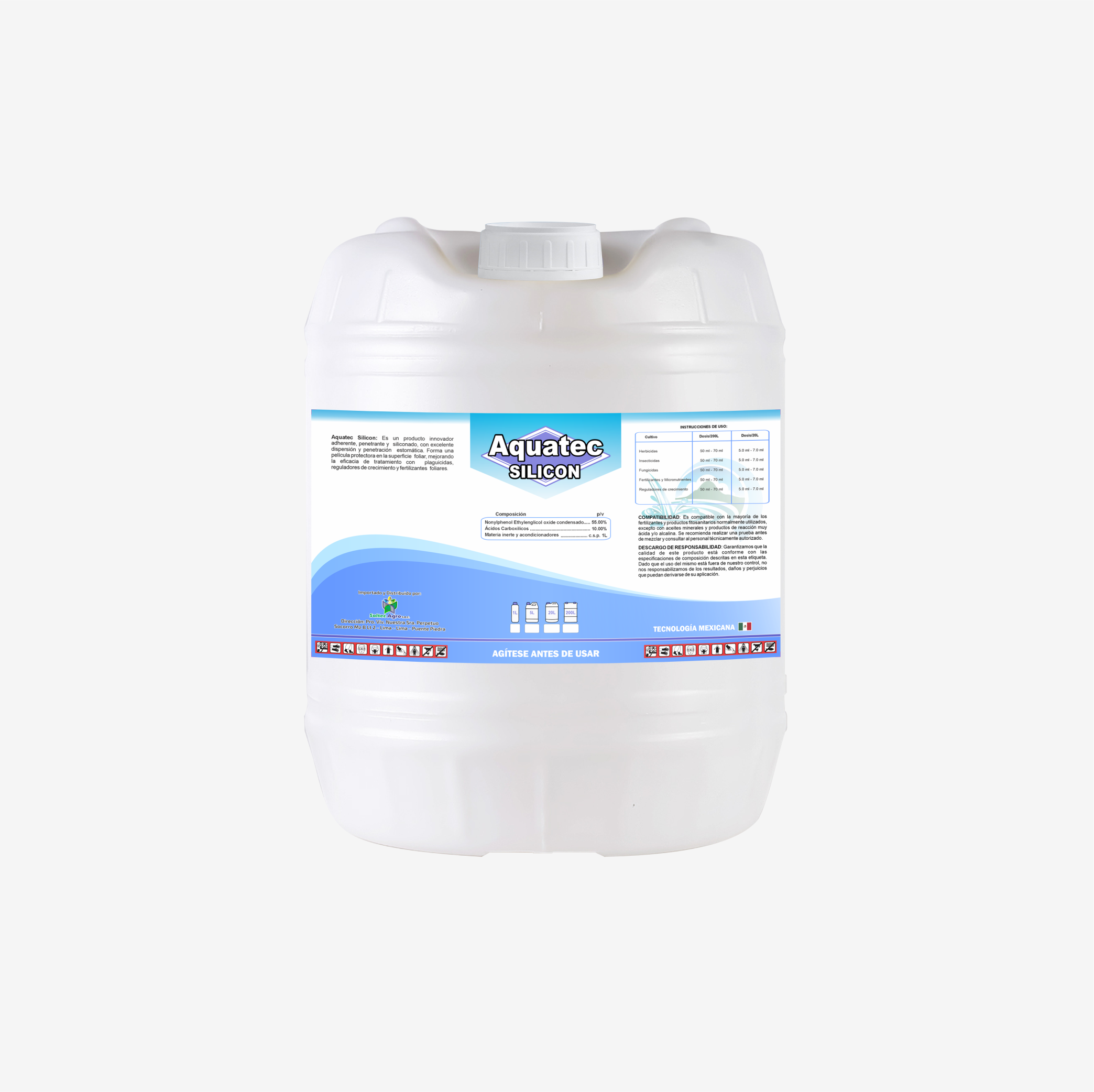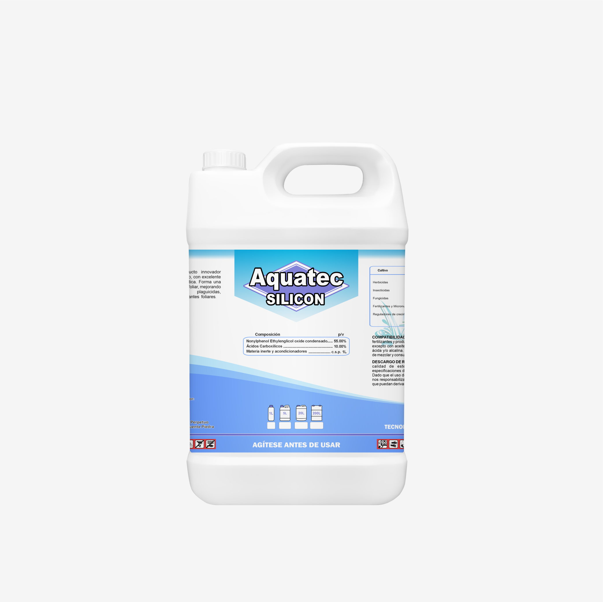 AQUATEC SILICON: Producto innovador que actúa como adherente, penetrante y siliconado, reúne cualidades de excelente dispersión y penetración estomática. Crea sobre la superficie foliar una película protectora ante la humedad ambiental. Esto influye en la eficacia de tratamientos con plaguicidas, reguladores de crecimiento y fertilizantes foliares.
