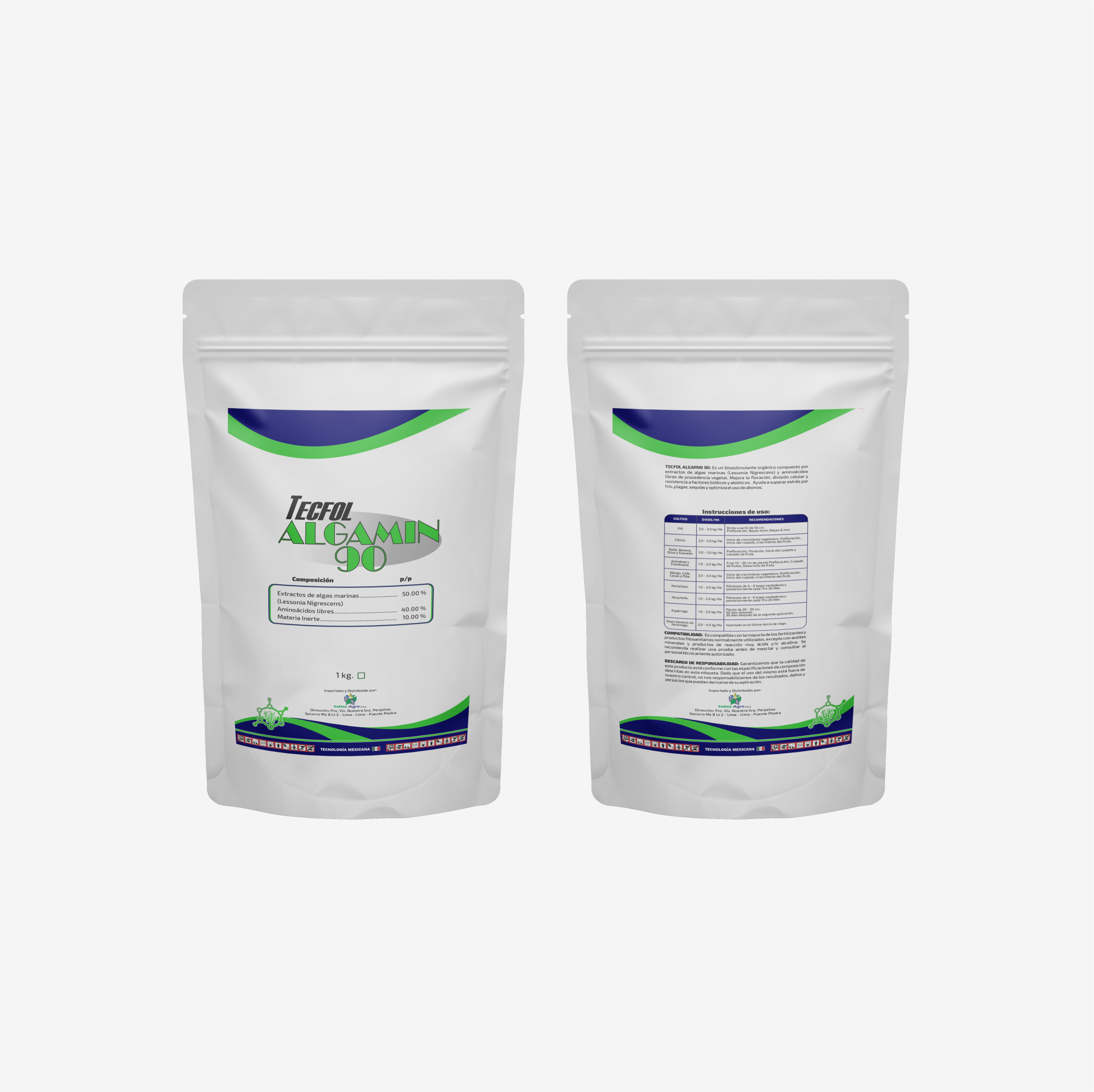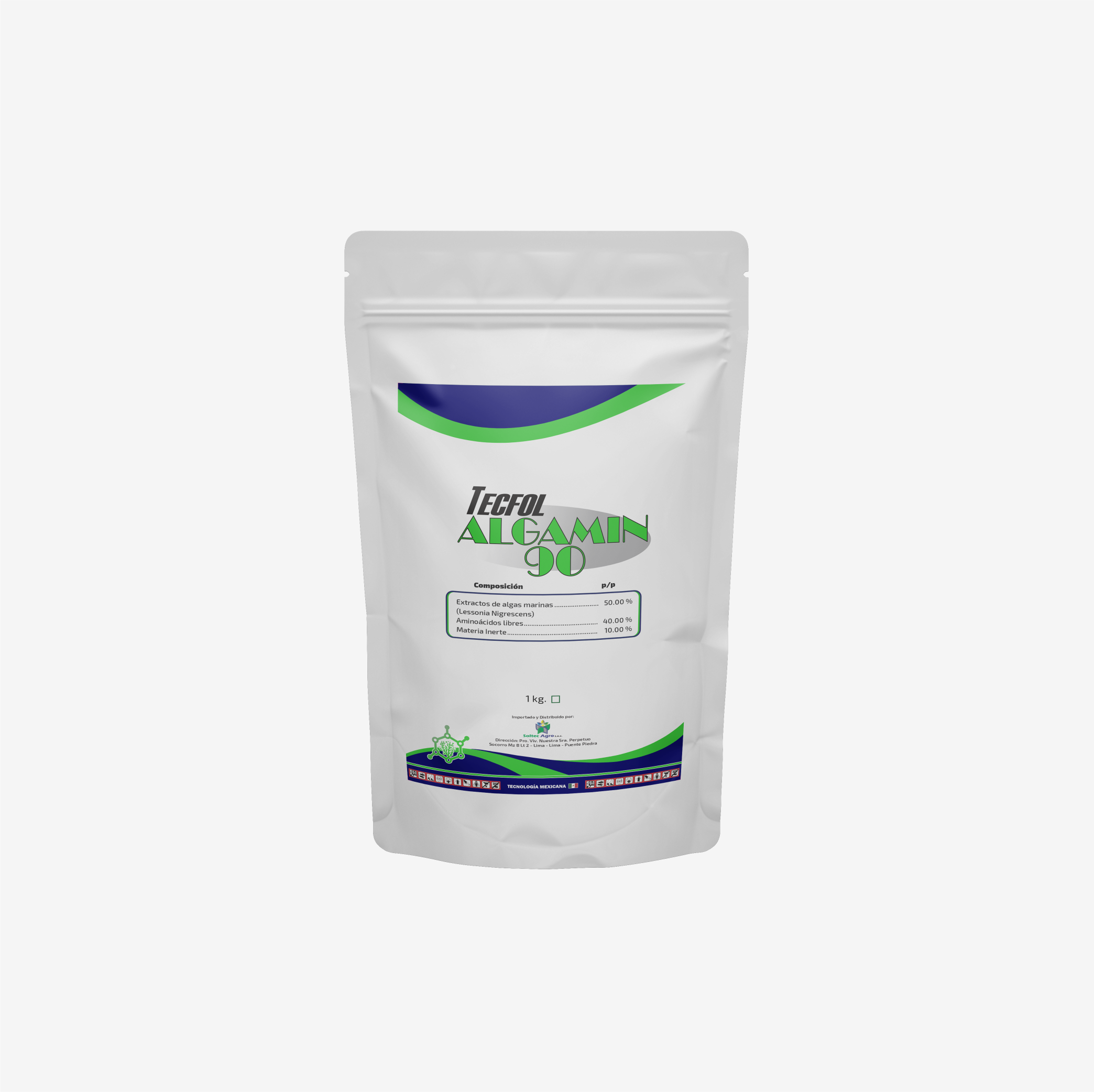 TECFOL ALGAMIN 90: Es un bioestimulante orgánico compuesto por extractos de algas marinas (Lessonia Nigrescens) y aminoácidos libres de procedencia vegetal. Mejora floración, división celular y resistencia a factores bióticos y abióticos. Ayuda a superar estrés por frío, plagas, sequías y optimiza el uso de abonos.