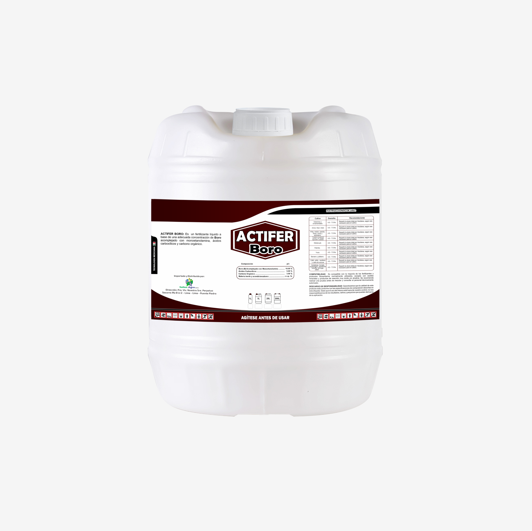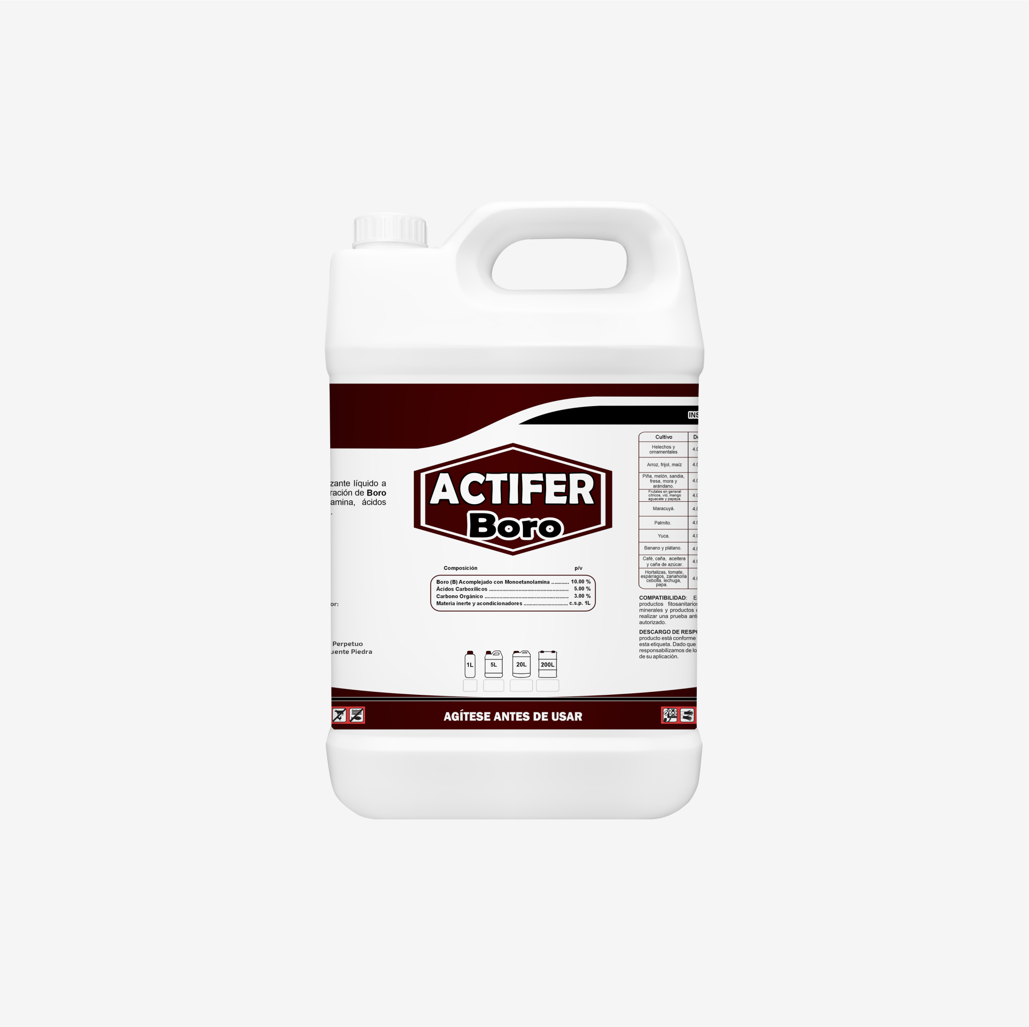 ACTIFER BORO: Es un fertilizante líquido a base de una adecuada concentración de Boro acomplejado con Monoetanolamina, Ácidos Carboxílicos y Carbono Orgánico.