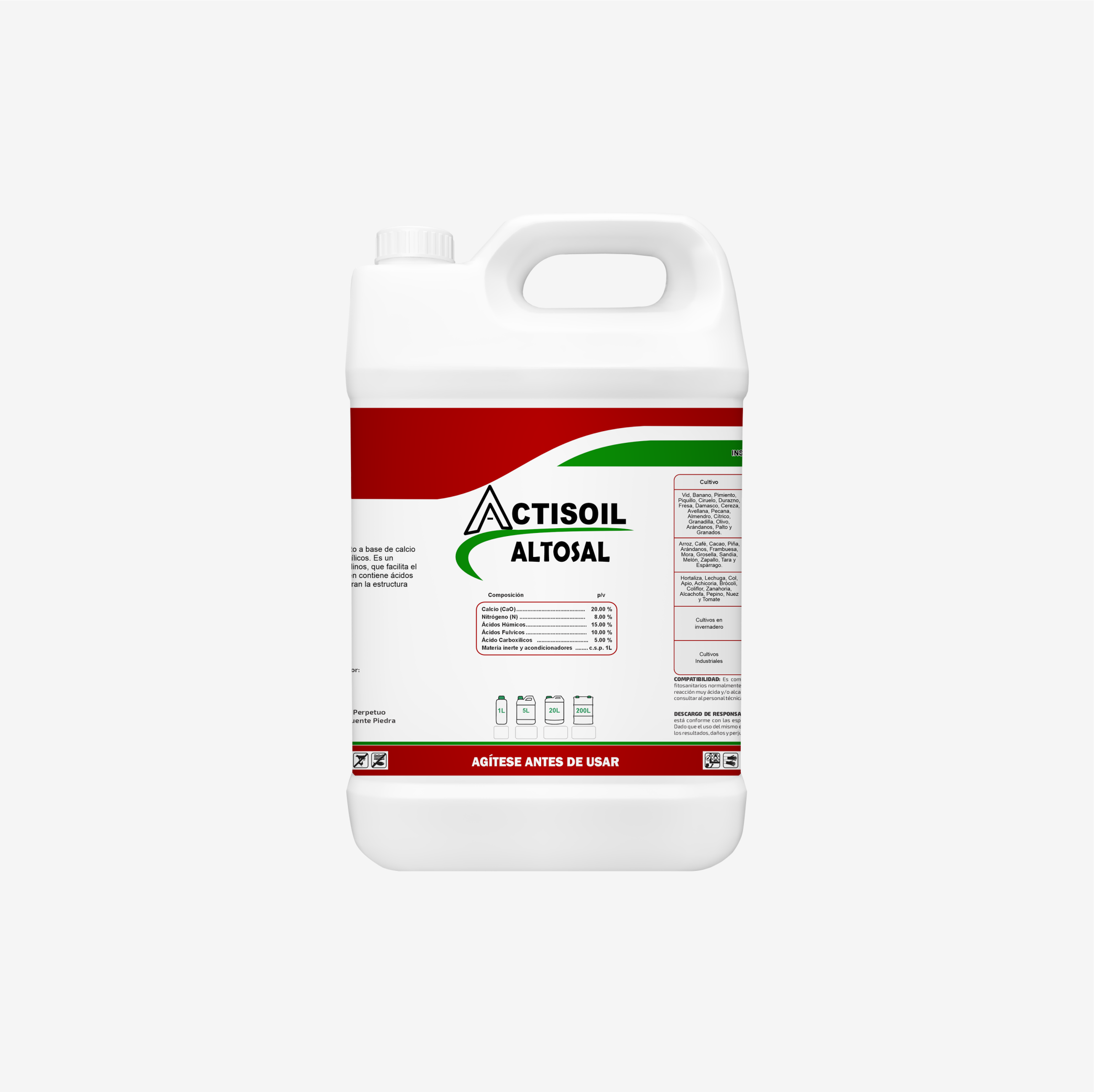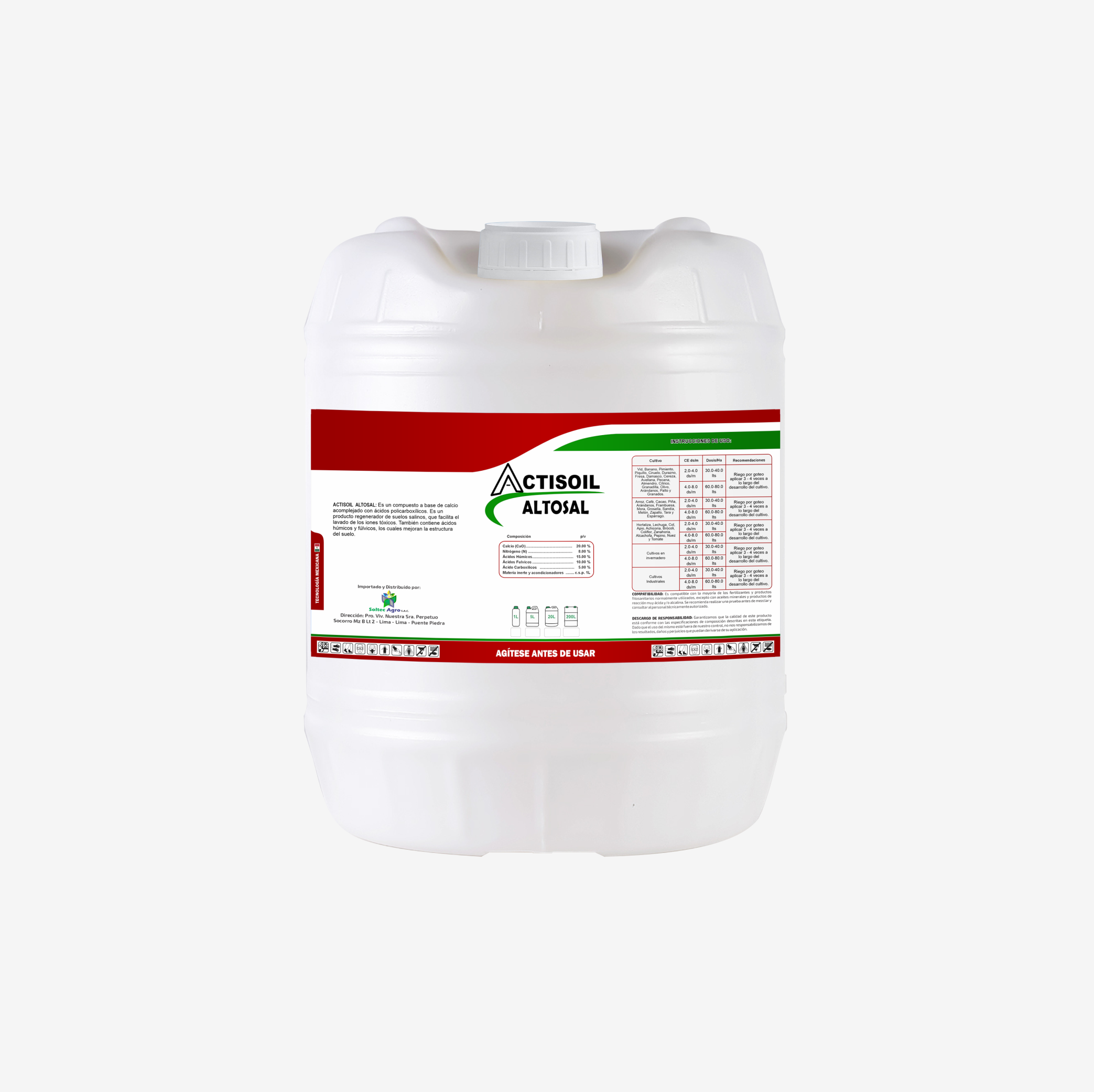 ACTISOIL ALTOSAL: Es un compuesto a base de calcio acomplejado con ácidos policarboxilicos. Es un producto regenerador de suelos salinos, aporta a la solución del suelo facilitando el lavado de los iones tóxicos. Contiene también ácidos húmicos y fulvicos que mejora la estructura del suelo.