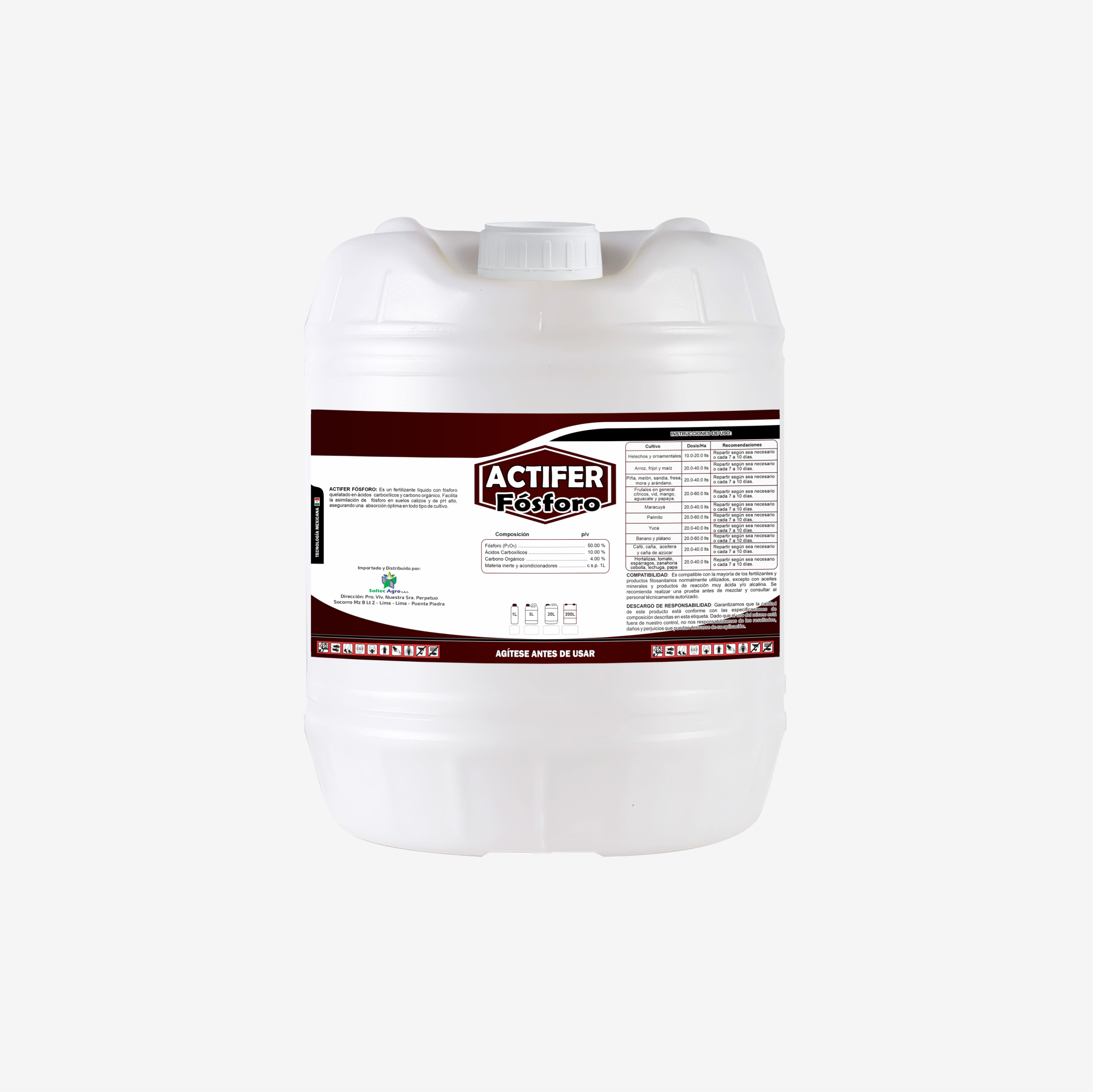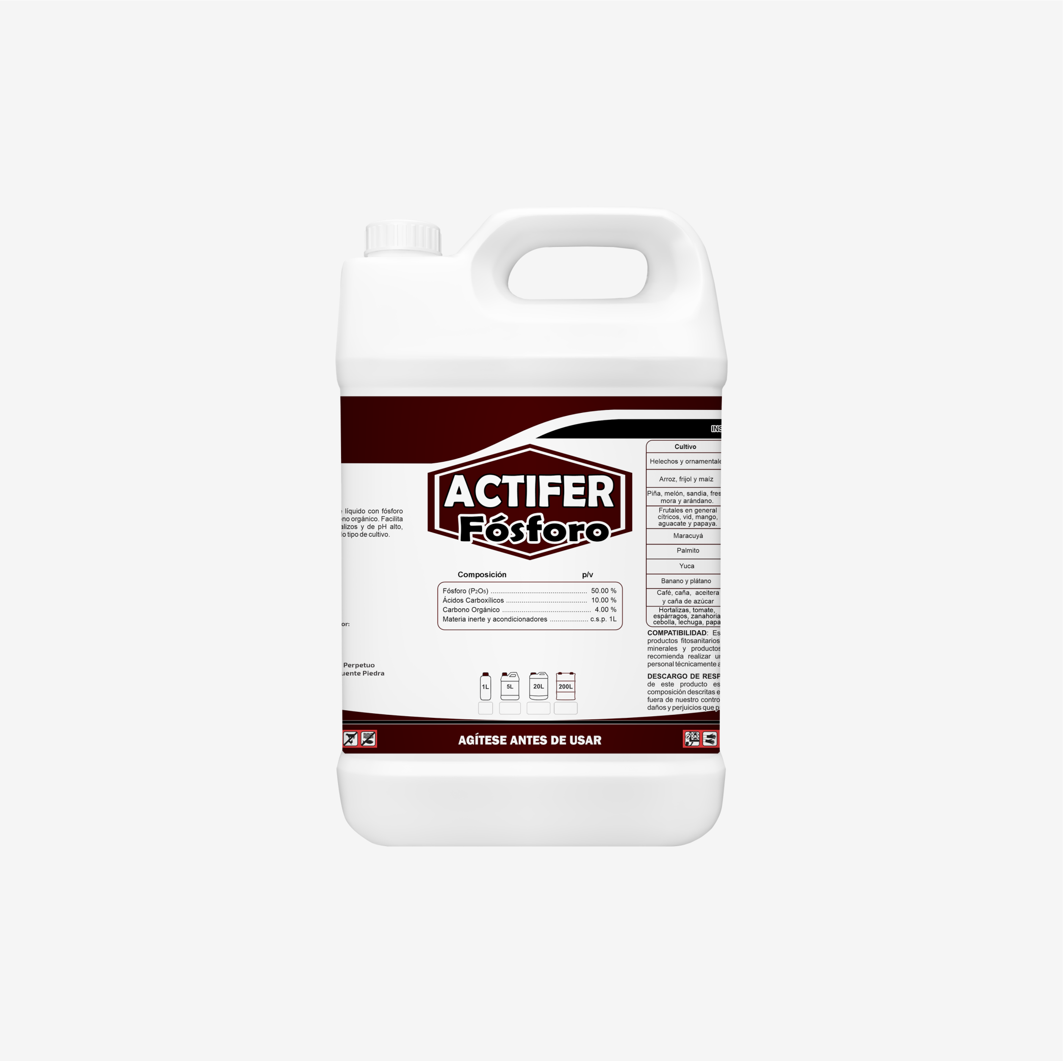 ACTIFER FOSFORO: Es un fertilizante líquido a base de una adecuada concentración de Fósforo quelatado por Ácidos Carboxílicos y Carbono Orgánico. Promueve la asimilación de fósforo en suelos calizos y de pH alto. Este producto está formulado para todo tipo de cultivo con una fuente de Fósforo adecuada para asegurar una optima absorción.