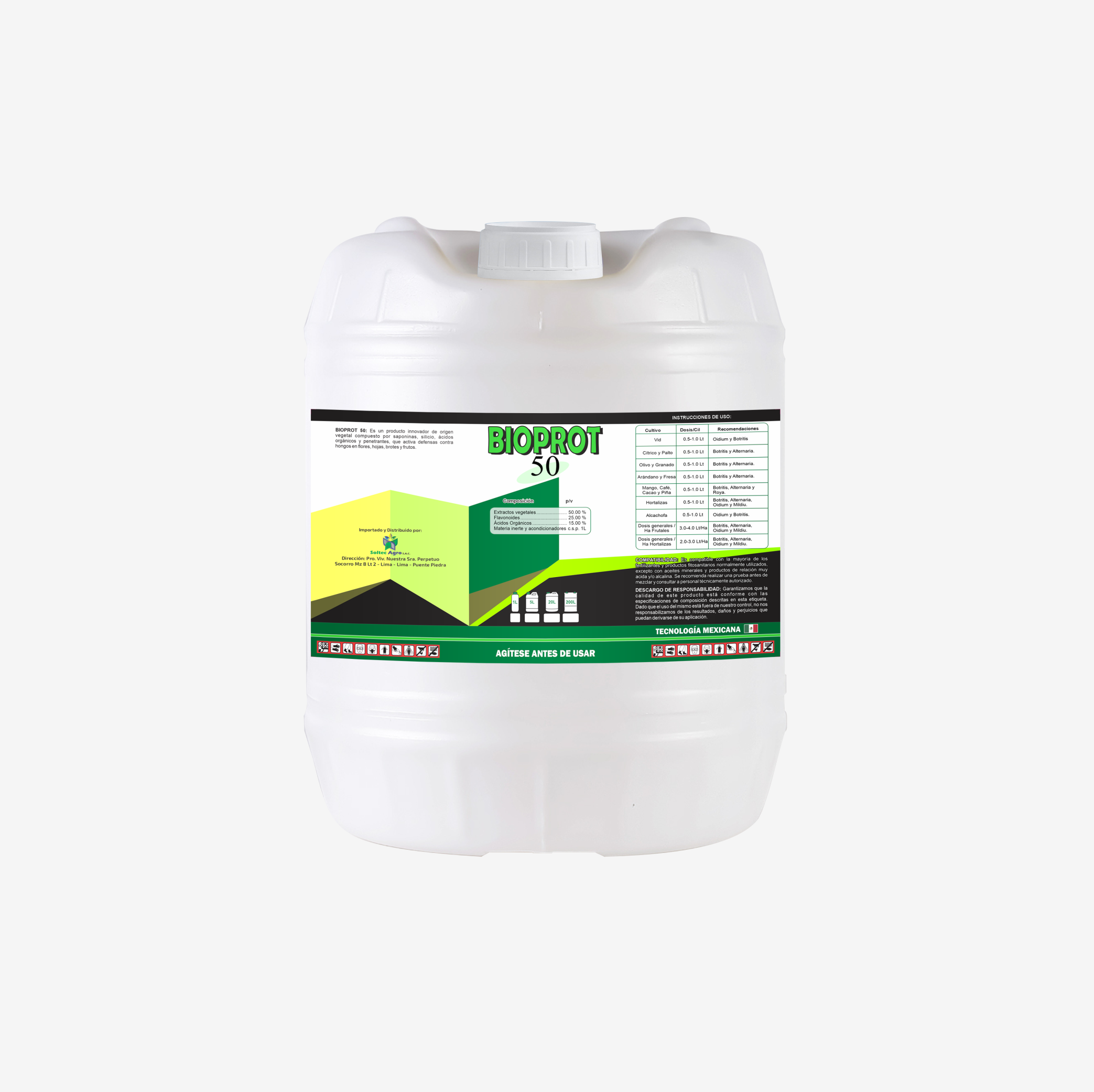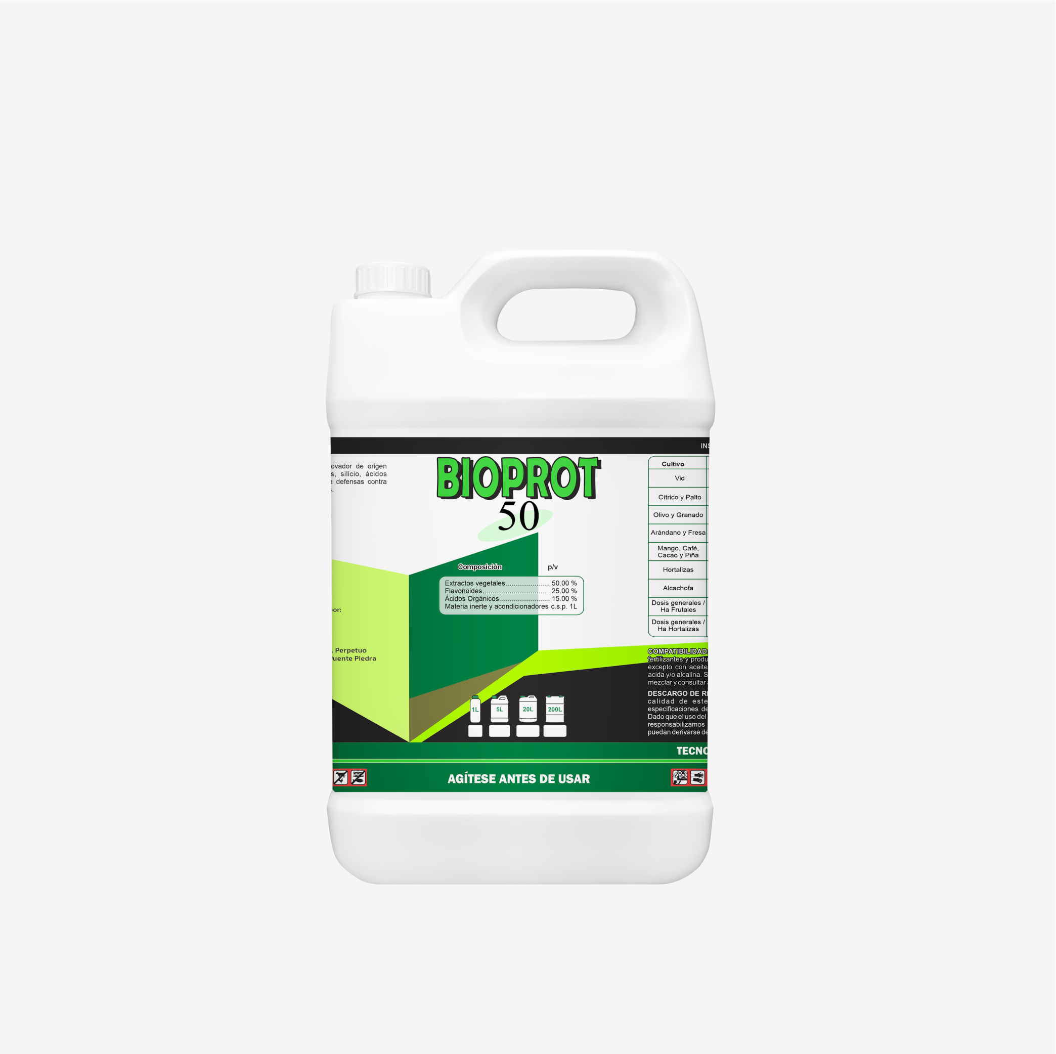 BIOPROT 50: Producto innovador a base de extractos vegetales compuesto por saponinas (Equisetonina), silicio, ácidos orgánicos y penetrantes, que generan un mecanismo de defensas contra infecciones fungosas de diversos tipos de hongos que infectan diferentes órganos de la planta (flores, hojas, brotes y frutos).