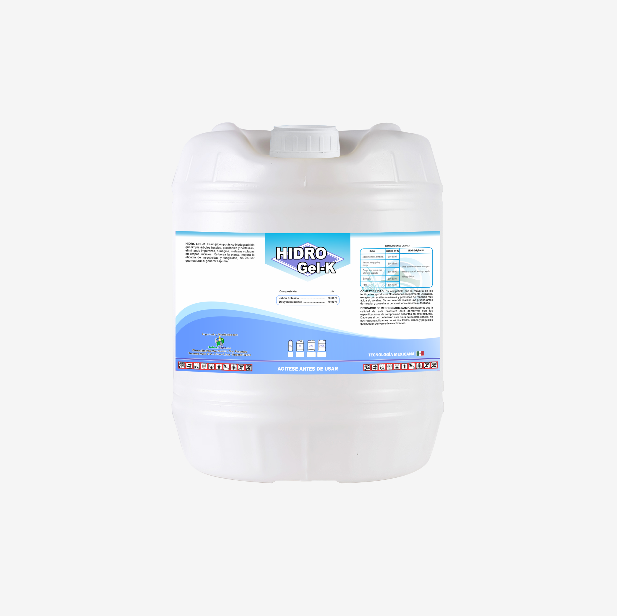 HIDRO GEL-K: Es un jabón potásico biodegradable que limpia árboles frutales, parronales y hortalizas, eliminando impurezas, fumagina, melazas y plagas en etapas iniciales. Refuerza la planta, mejora la eficacia de insecticidas y fungicidas, sin causar quemaduras ni generar espuma.