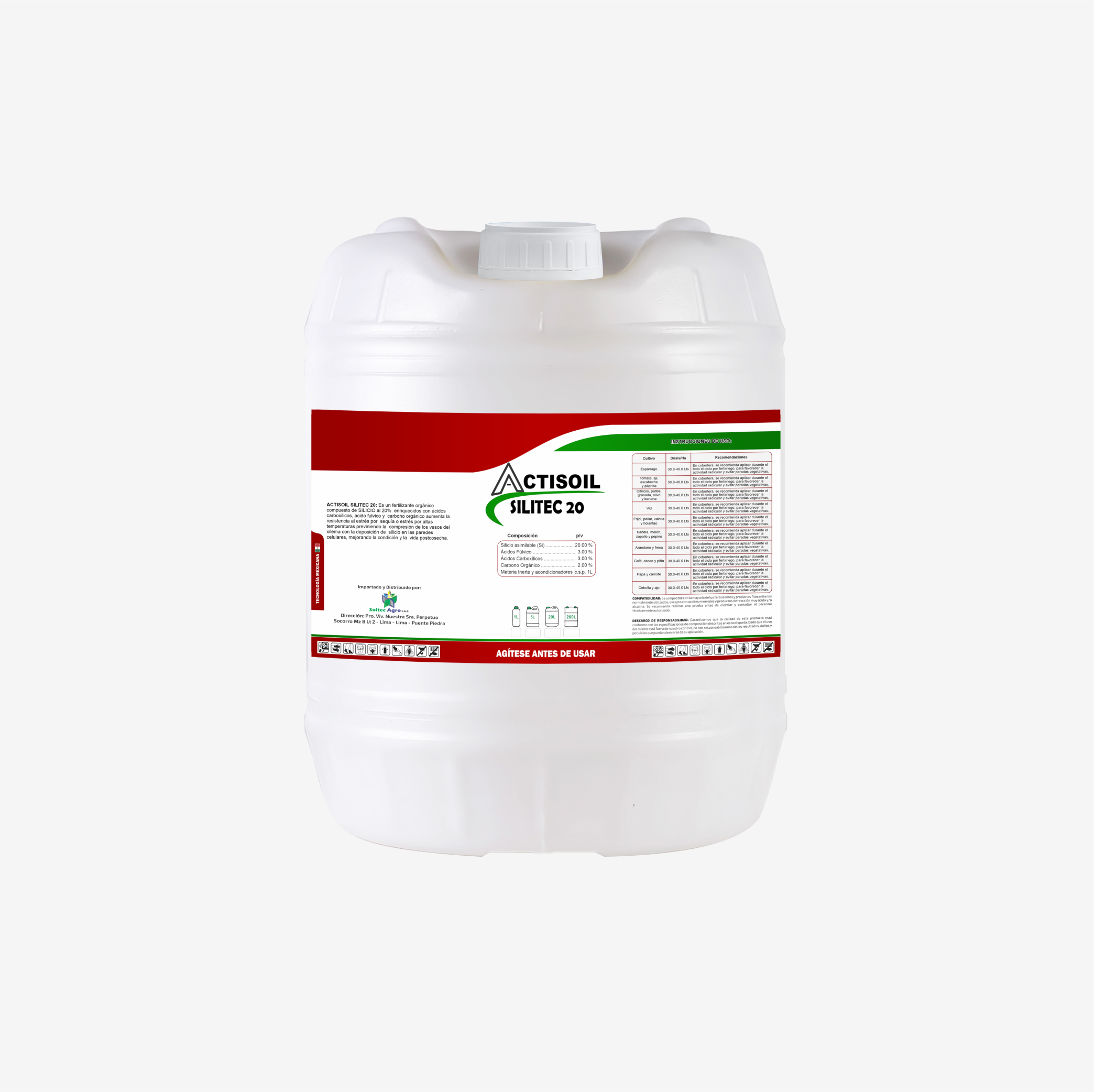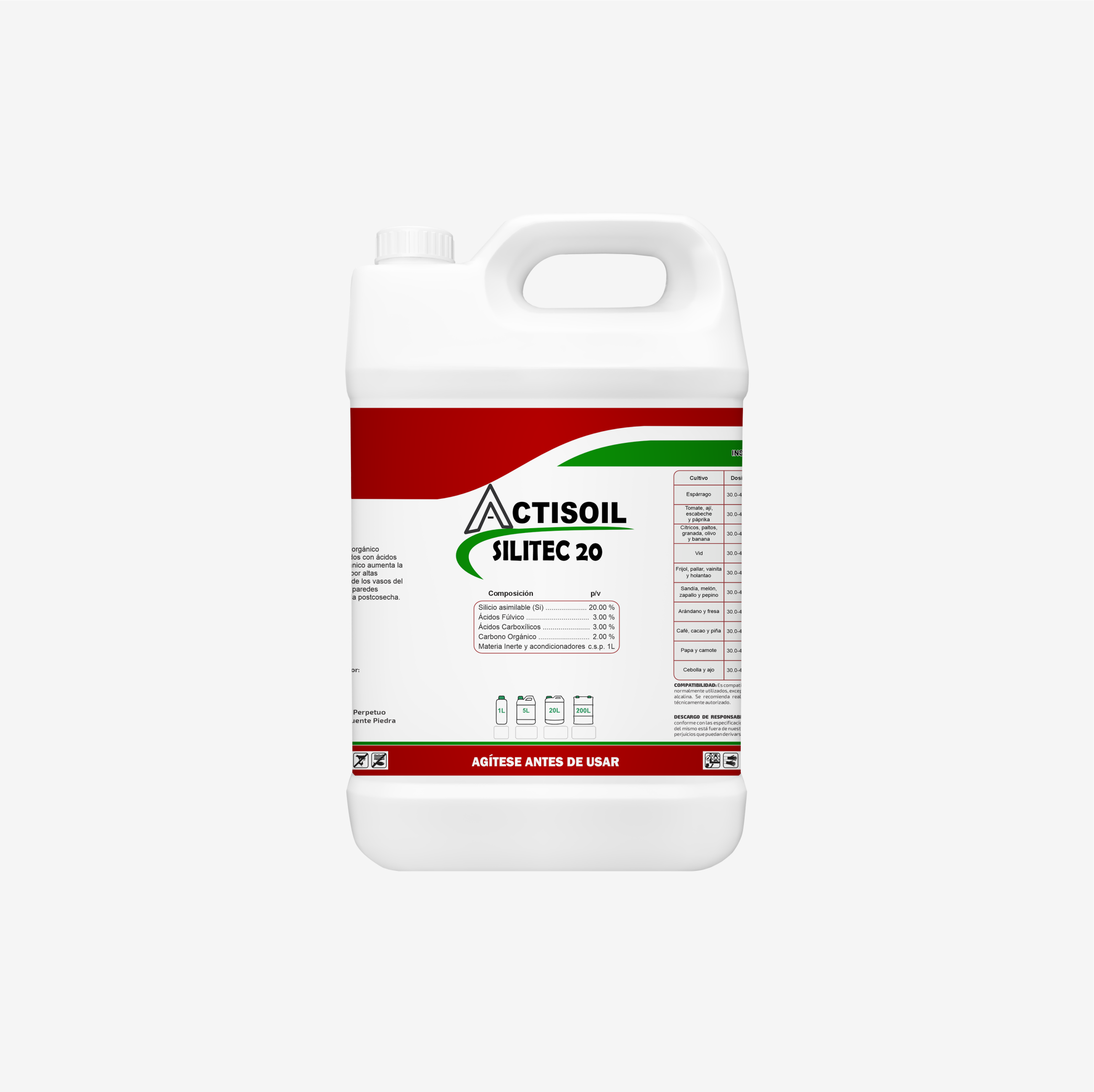 ACTISOIL SILITEC 20: Es un fertilizante orgánico compuesto de SILICIO al 20% enriquecidos con ácidos carboxilicos, acido fulvico y carbono orgánico aumenta la resistencia al estrés por sequía o estrés por altas temperaturas previniendo la compresión de los vasos del xilema con la deposición de silicio en las paredes celulares, mejorando la condición y la vida postcosecha.